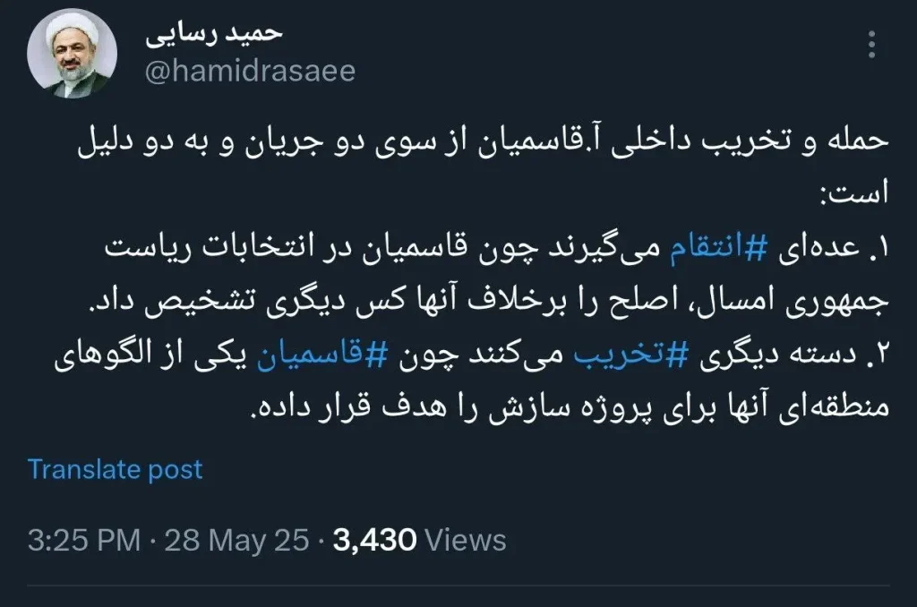 رسایی: قاسمیان را به خاطر هدف قرار دادن یکی از الگوهای منطقهای پروژه سازش، تخریب می کنند